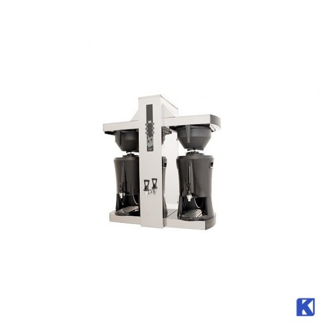 Rask og letthåndterlig urnebrygger med uttak for tevann. 2 stk 5 liters unikt designet vakuumtermoser (serveringsstasjon) med tappekran, nivårør, integrerte håndtak og roteringsfunksjon. Trakting på begge sidene samtidig. Hel- eller halvtraktingssfunksjon samt kaffen er klar signal. Full trakting 10 liter tar bare 7 min. 400V (3 fas).
