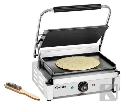 Kvalitet: Rustfritt Stål Effekt: 230 volt 1 fas 2200 W Mål (bxdxh): 41x37x20 cm - Bartscher pressgrill panini glatt plate oppe og nede - Grillplater i støpejern - Termostat: 50 til 300 grader - Mål på øvre grillplate: 33,5x22 cm - Mål på nedre grillplate: 33,5x23 cm - Medfølger: 1 rengjøringsbørste - Vekt: 19 kg